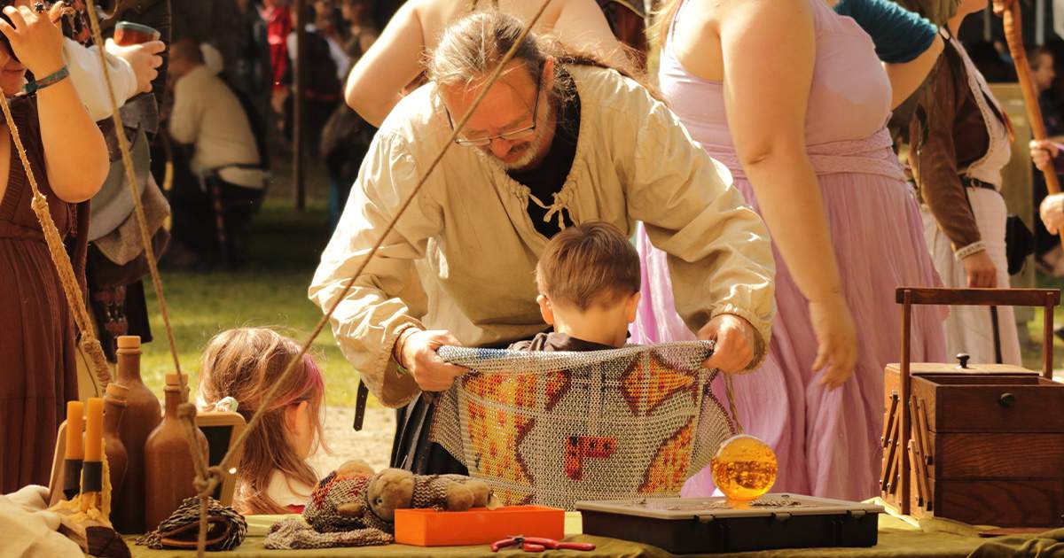 The public is invited, in an accessible setting, to participate in activities or experience our crafts during demonstrations in: felting, metal-, leatherworking and weaving chain mail.